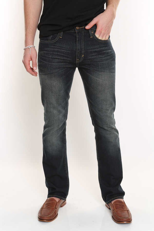 Lightly faded cotton denim. Sits below waist. Slim through hip and thigh. 15" leg opening. Zip fly. Machine wash. - Informação Adicional